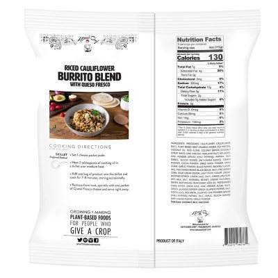 NO TRANS-FAT ONLY NATURAL INGREDIENTS- Grated cauliflower florets plant-based meat roasted corn black beans cilantro and stone-ground spices. Riced Cauliflower Burrito Blend with Queso Fresco. Tattooed Chef Riced Cauliflower Burrito Blend Calories and Nutritional Information.